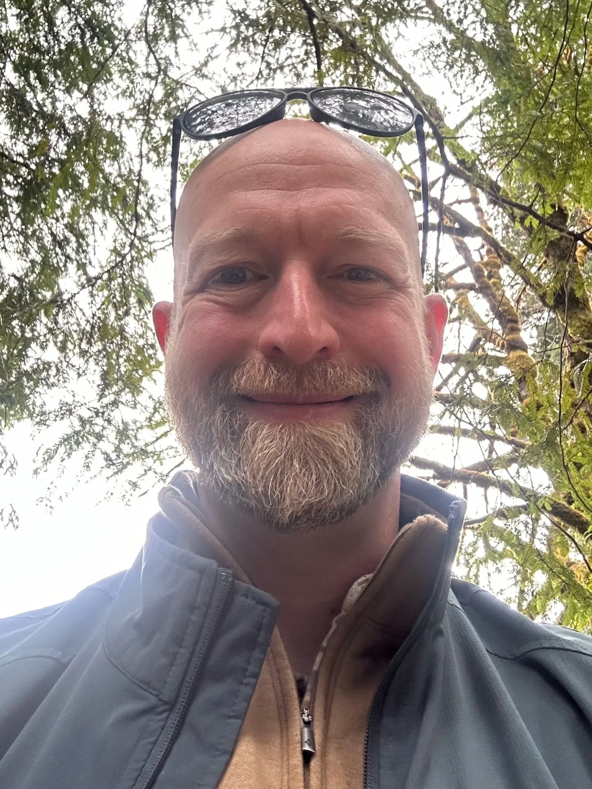 smiling man with brown hair and blue shirt